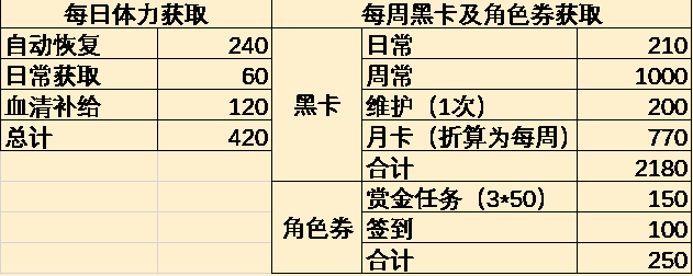每日420体力,包含月卡在内每周2180黑卡,基础角色券250。