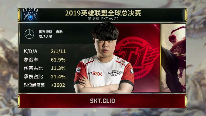 【G2 1-0 SKT】首局SKT选到了奇招妮蔻中单,而G2则选到了克烈上单。前期双方相对平稳,只打了一些小的人头互换;但后期SKT尝试rush大龙时被G2抓到机会,终于G2的霞神发挥打出一波1换5后顺势一波结束比赛!恭喜@G2电子竞技俱乐部 拿下比赛胜利!